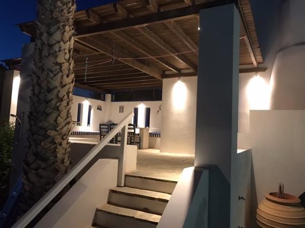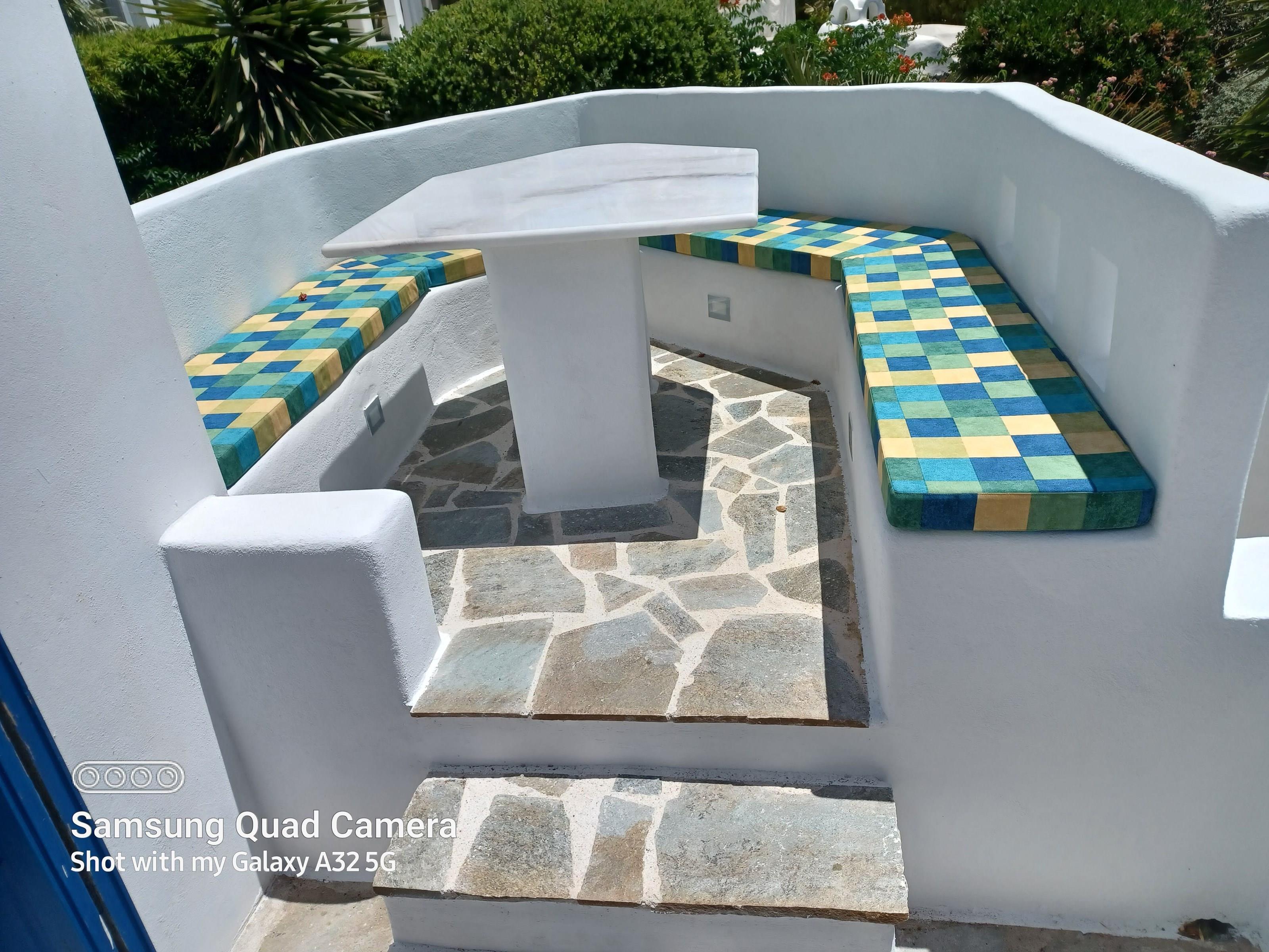 There are three terraces of different sizes and aspects with one large covered terrace , with a substantial marble table to seat 6 – 8 comfortably . By the pool there is a further fixed marble table and chairs to allow guests to enjoy a BBQ by the pool in the cool of the evening.